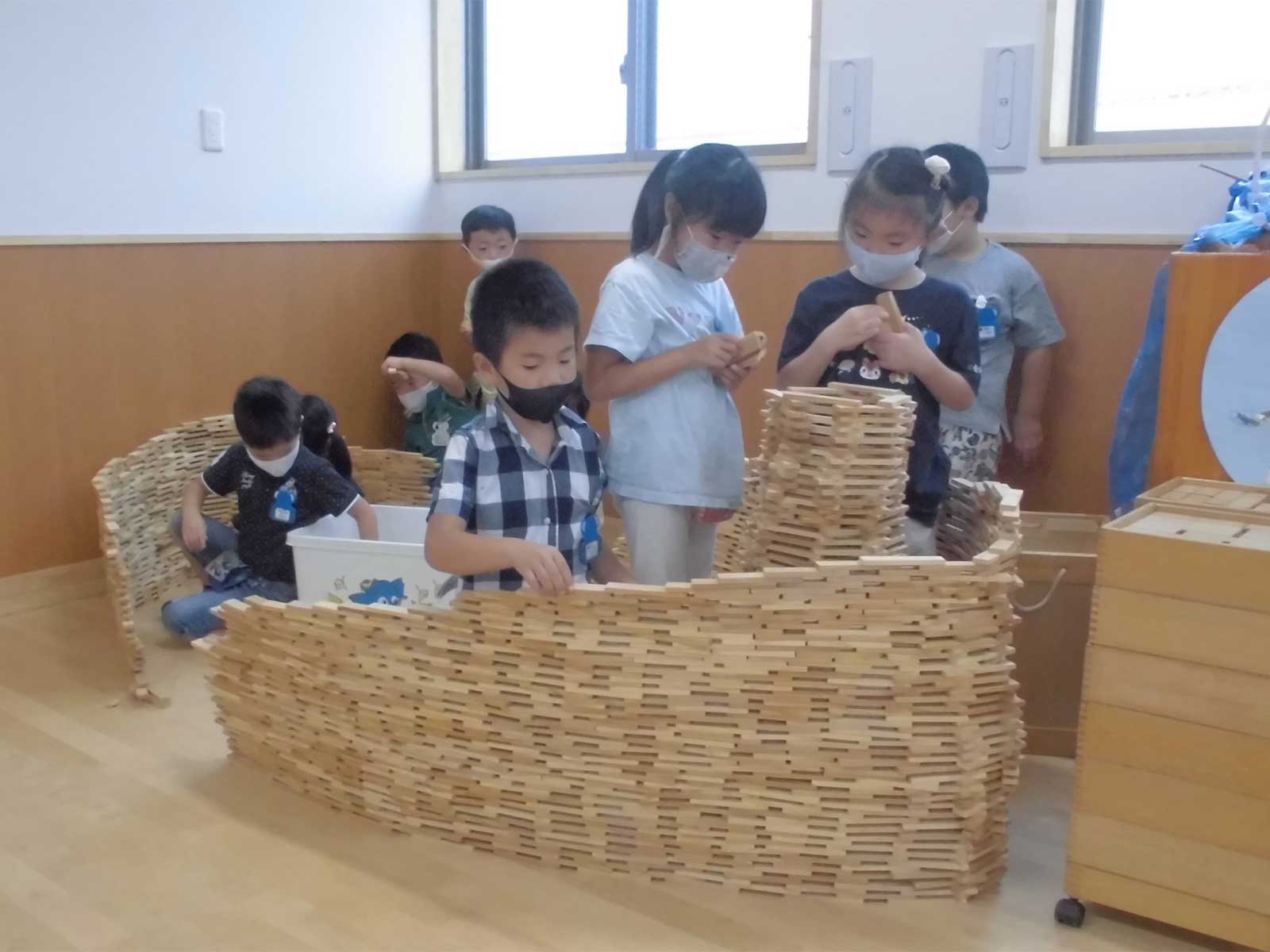 室内では、『ままごと』『積木』『線路や電車をつなげる遊び』『パズル』等自分の好きな遊びを見つけ、落ち着いて遊べるように環境作りしています。